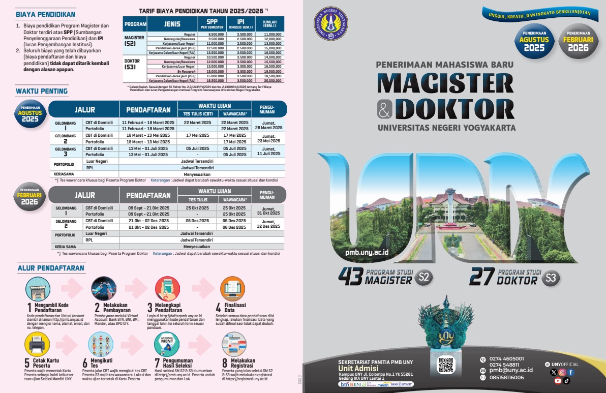 Informasi penerimaan mahasiswa baru Magister dan Doktor Universitas Negeri Yogyakarta, Universitas Negeri Yogyakarta (UNY) membuka penerimaan mahasiswa baru program Magister (S2) dan Doktor (S3) tahun akademik 2025/2026 melalui laman resmi pmb.uny.ac.id. dengan dua periode pendaftaran yaitu Agustus 2025 dan Februari 2026. Tersedia 43 program studi Magister dan 27 program studi Doktor yang dikelola Sekolah Pascasarjana serta fakultas penyelenggara pascasarjana UNY. Jalur seleksi meliputi CBT di Domisili, Portofolio, Luar Negeri, RPL, dan Kerja Sama, dengan tahapan tes tulis, wawancara, dan registrasi ulang. Biaya pendidikan terdiri atas SPP dan IPI, yang disesuaikan dengan program studi. Pendaftaran dilakukan sepenuhnya secara daring melalui delapan langkah mulai dari pengambilan kode pendaftaran, pembayaran, pengisian data, hingga registrasi ulang bagi peserta yang lulus. Informasi lebih lanjut dapat diperoleh di Unit Admisi UNY, Gedung Rektorat Lama Lantai 1, atau melalui kontak resmi (0274) 4605001, email pmb@uny.ac.id dan WhatsApp 0815-8116-006